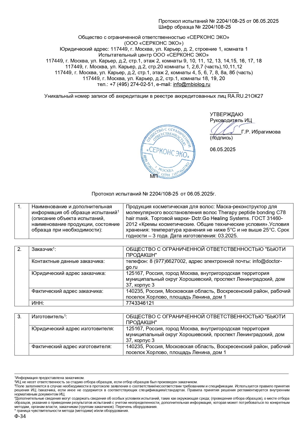 Вложимость в коробках (кол-во шт в 1 коробке): 20 Анонс: Супер ХИТ! код ТН ВЭД: 3305900009 Бренд: DctrGo Healing Systems Вес: 0,05 Производитель: ООО Бьюти продакшн Страна производитель: Россия Тип упаковки: Ваакумный диспенсер Сезон: Всесезонный продукт Год создания: 2024 Нишевая парфюмерия: Tiziana Terenzi Kirke Extrait de Parfum Название модели: Peptide Bonding 78 Класс опасности товара: не опасен Пол: унисекс Область использования: Москва Эффект: Молекулярное восстановление Тип волос: Для всех типов волос Единиц в одном товаре: 1 Условия хранения: от +5 до + 25 Способ применения: Нанести на влажные волосы после шампуня Срок годности: 36 мес - 2 отзыва к товару Несмываемая маска для восстановления волос после окрашивания и осветления Therapy peptide bonding C78 hair mask в Брянске